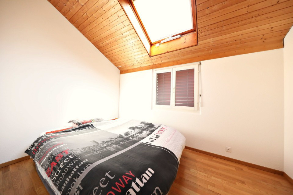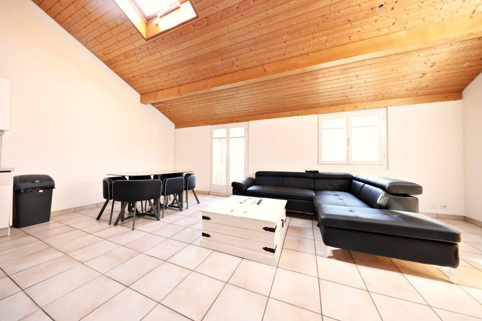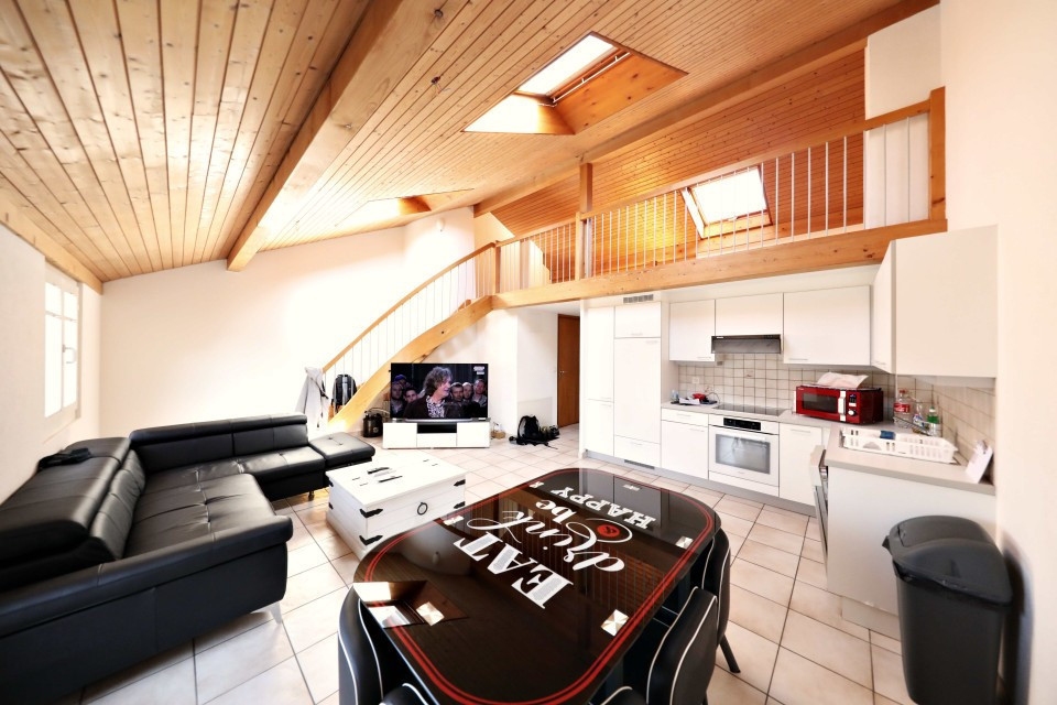 Trés bel appartement de 3.5 pièces (85m2) à louer à La Croix sur Lutry, au dernier étage comprenant un hall, 2 chambres, une cuisine équipée ouverte sur une salle à manger/séjour, une cheminée, une salle de bain/WC, une mezzanine habitable et 2 balcons (Nord et Sud). Chauffage au sol.